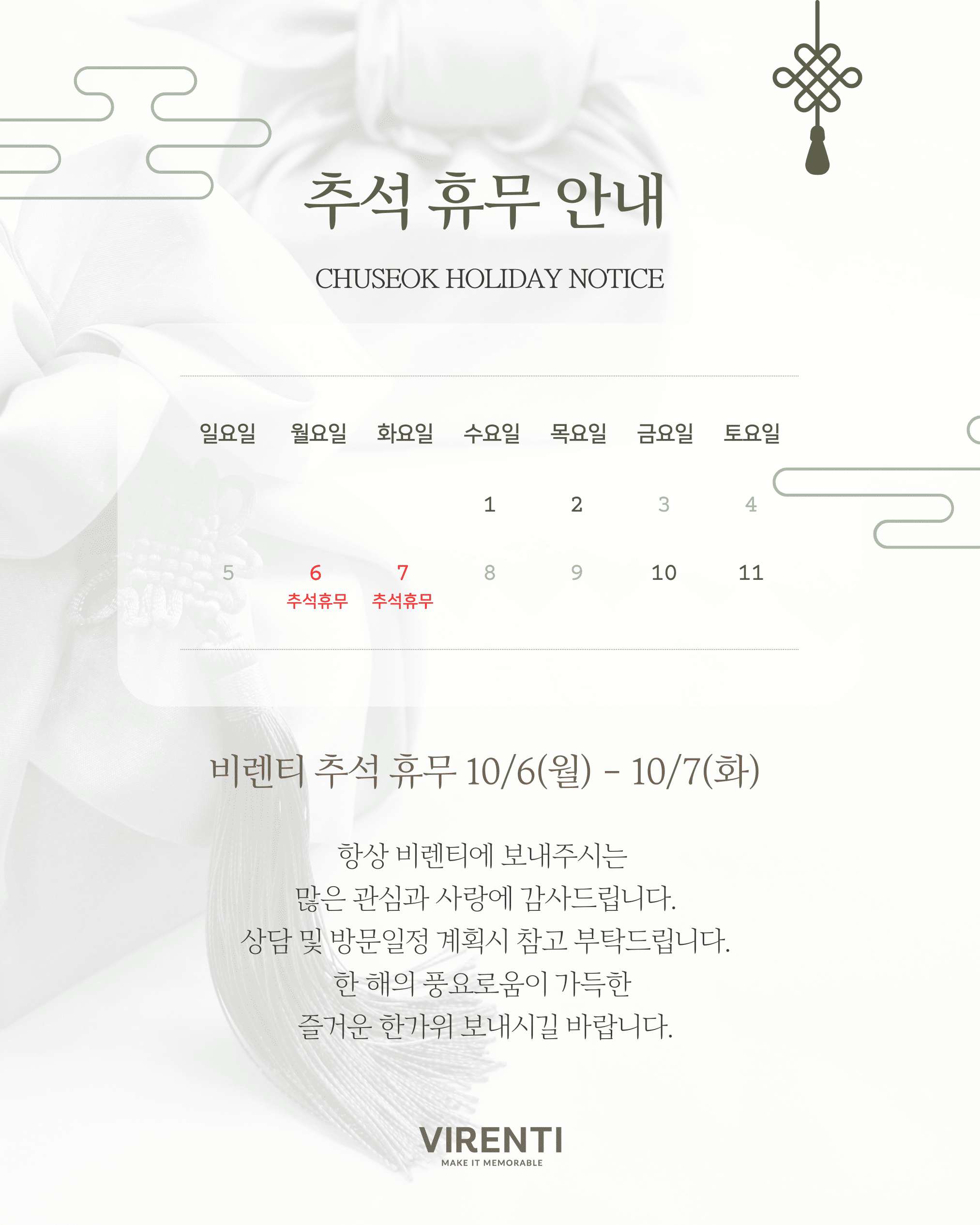 Ãß¼®ÈÞ¹« ¾È³» ºñ·»Æ¼ Ãß¼®ÈÞ¹«´Â 10/6(¿ù)-10/7(È)ÀÔ´Ï´Ù. ÇÑ ÇØÀÇ Ç³¿ä·Î¿òÀÌ °¡µæÇÑ Áñ°Å¿î ÇѰ¡À§ º¸³»½Ã±æ ¹Ù¶ø´Ï´Ù.